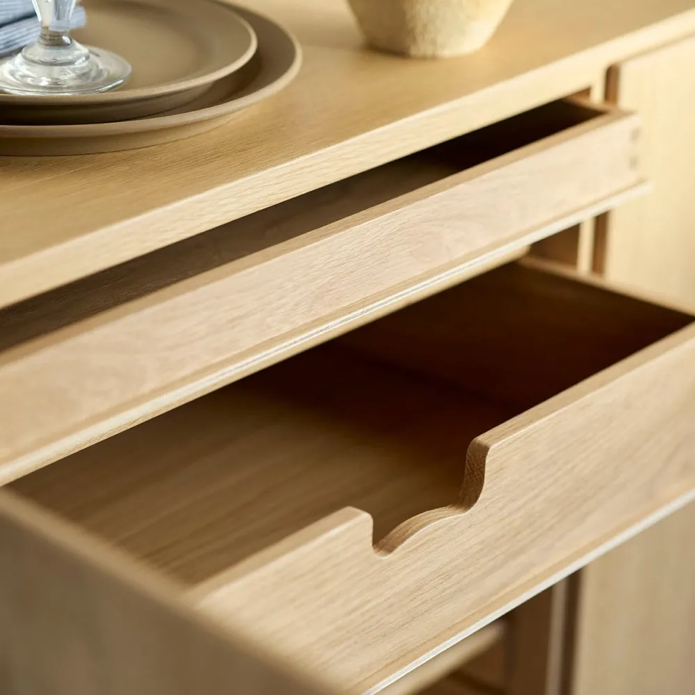 Børge Mogensens skænk, A232, optrådte første gang i FDB Møblers katalog tilbage i 1964. Siden har den været et eftertragtet vintagemøbel, og nu indgår den igen i FDB Møblers sortiment. Med sit funktionalistiske udtryk, er den en fornem repræsentant for et af dansk møbeldesigns største navne og et møbel, der både giver hjemmet et stilsikkert udtryk og en masse opbevaringsmuligheder. Den er produceret i FSC®-certificeret finér med specialfremstillede messingdele. Bakkerne kan tilkøbes i forskellige størrelser, så skænken kan indrettes til individuelle behov.