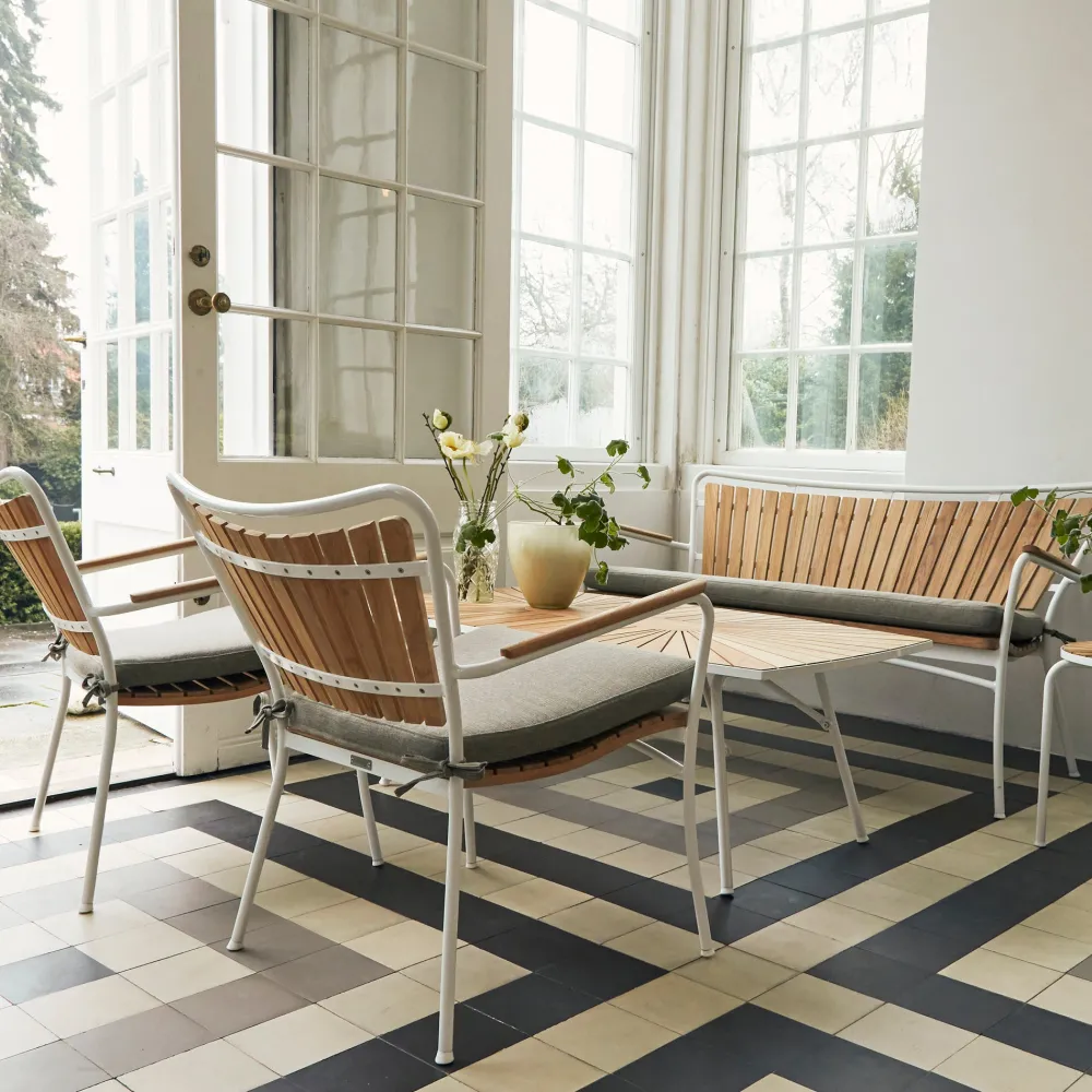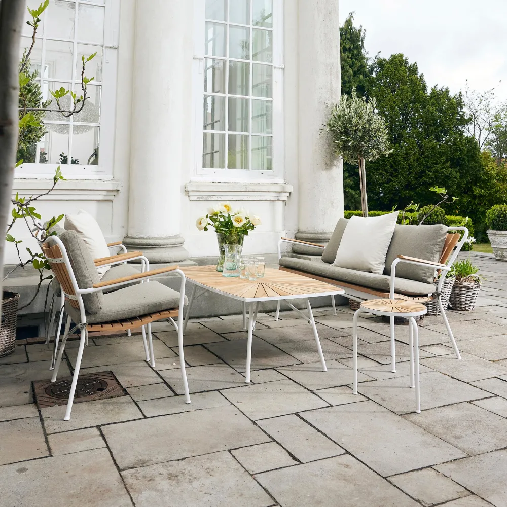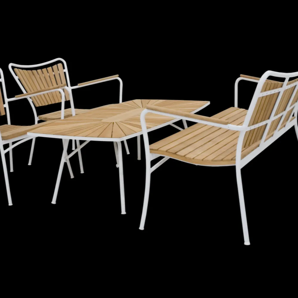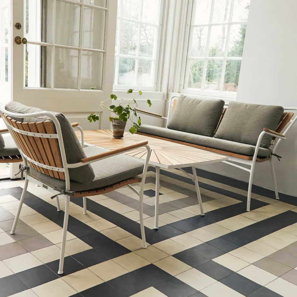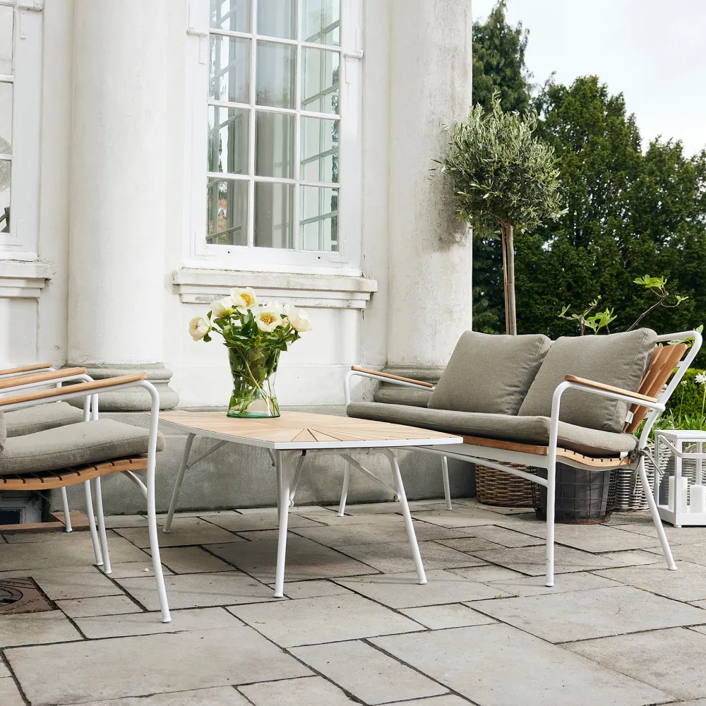Når du vil nyde aftenen i komfort med Marguerit loungesættet. Havesættet inkluderer et lavt bord, to loungestole og en loungesofa, perfekt til at skabe dit eget hyggelige loungeområde på terrassen eller indrette udestuen på en ny og indbydende måde. For ekstra komfort kan du tilføje hynder og puder i 100% polyester i en stilfuld armygrøn farve. Teaktræet påvirkes af det skandinaviske vejr, så husk at følge anvisningerne på de vedligeholdelsesprodukter, du vælger, for at sikre langvarig holdbarhed.