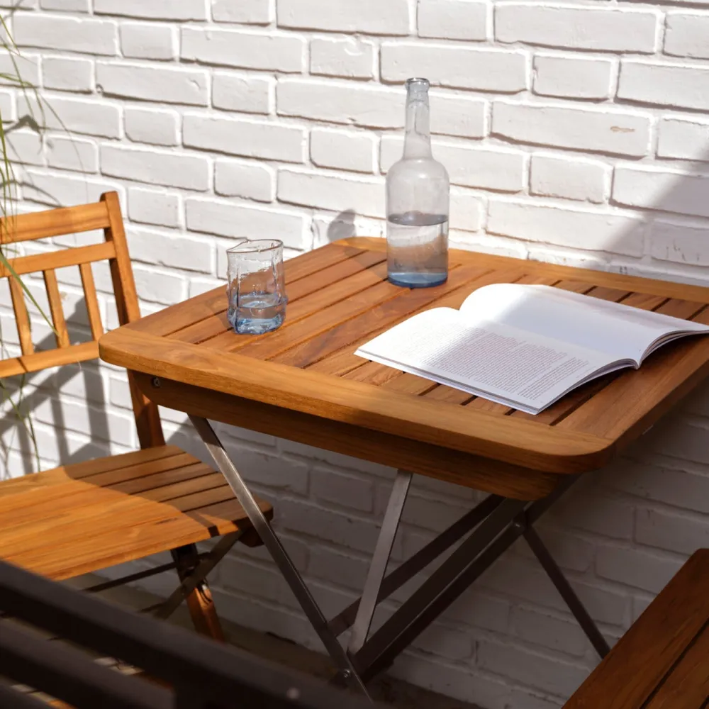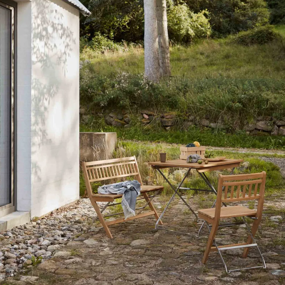 Lilleø er et fleksibelt udemøbelsæt designet af Thomas E. Alken og produceret i teaktræ og rustfrit stål. Møblerne har et let og underspillet skulpturelt udtryk, der klæder omgivelserne, og sættet passer perfekt til steder, hvor pladsen er beskeden, men hvor kravet til æstetik, komfort og funktionalitet stadig vægtes højt. Lilleø kan klappes sammen, så de fylder ganske lidt i opbevaringen, og er derfor ideel til altaner, gårdhaver eller hyggelige caféer med små udendørsområder. Lilleø-sættet er en del af Sammen-serien, der er en af FDB Møblers populære havemøbelserier, også designet af Thomas E. Alken.
