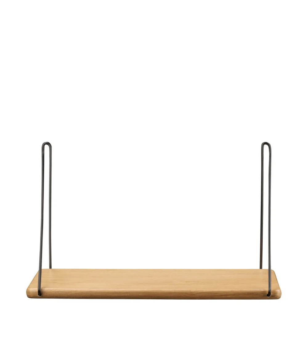 B145 er en stilren hylde med et utal af anvendelsesmuligheder og samtidig en hilsen fra dansk designs guldalder. Tegningerne af Ejvind Johanssons hylde dukkede nemlig op af FDB Møblers arkiver, og det viste sig, at det var et af de første møbler, den legendariske designer tegnede som leder af FDB Møblers tegnestue. I dag er hylden kommet i produktion og fremstår tidløs og aktuel i fineret eg med to bøjler som hyldeknægte i enten børstet rustfri stål eller sortmalede. Hylden fås i forskellige længder og kan kombineres i et utal af muligheder eller hænge for sig selv, hvor du har brug for en hylde, som er både smuk og funktionel.
