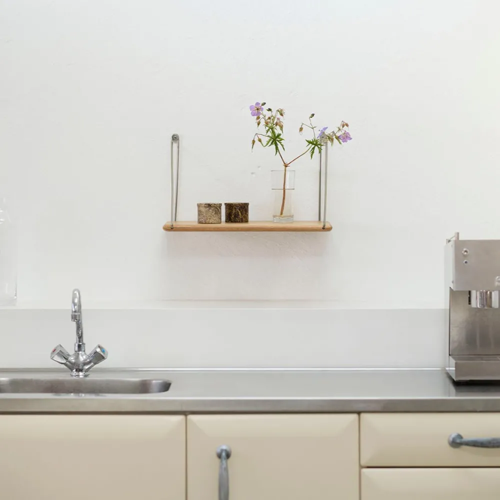 B145 er en stilren hylde med et utal af anvendelsesmuligheder og samtidig en hilsen fra dansk designs guldalder. Tegningerne af Ejvind Johanssons hylde dukkede nemlig op af FDB Møblers arkiver, og det viste sig, at det var et af de første møbler, den legendariske designer tegnede som leder af FDB Møblers tegnestue. I dag er hylden kommet i produktion og fremstår tidløs og aktuel i fineret eg med to bøjler som hyldeknægte i enten børstet rustfri stål eller sortmalede. Hylden fås i forskellige længder og kan kombineres i et utal af muligheder eller hænge for sig selv, hvor du har brug for en hylde, som er både smuk og funktionel.