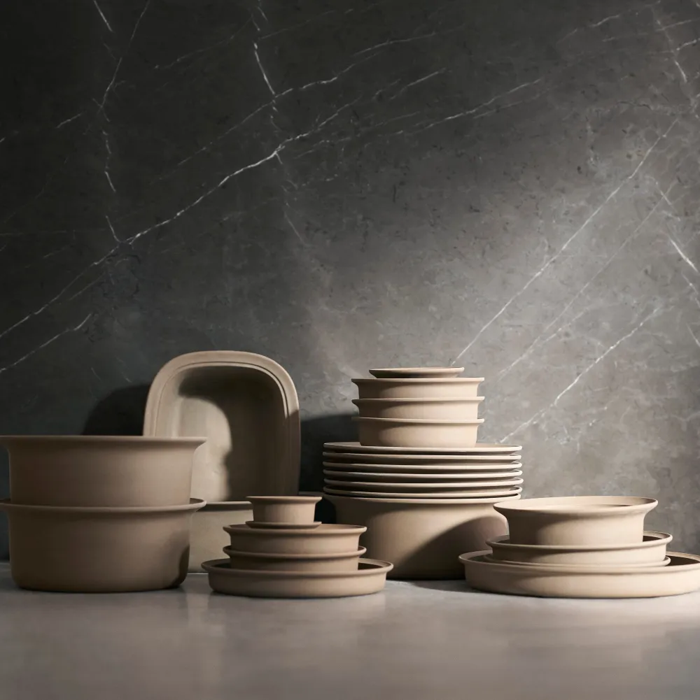 Stentøjsserien Ildpot var i 1970’erne et nybrud inden for den danske husholdning. Kvinderne var kommet ud på arbejdsmarkedet, hvilket satte nye krav til madlavning og servering. Med Ildpot kunne stellet gå direkte fra fryseren, ind i ovnen og videre hen på middagsbordet. Derved blev aftensmåltidet både let og overskueligt. Nu relancerer FDB denne ikoniske stentøjsserie, der blev tegnet af den anerkendte designer Grethe Meyer (1918-2008), som hørte til blandt den danske designelite og som havde et livslangt arbejdssamarbejde med møbelarkitekten Børge Mogensen. For Grethe Meyer var det afgørende, at Ildpot var et funktionelt stel. Derfor undersøgte hun nøje, hvordan de mange forskellige skåle og fade skulle udformes for at udnytte pladsen i forbrugerens ovn og skabe. Hun gennemprøvede alle delene i sit eget køkken og sikrede derved, at de var funktionsdygtige og pladsbesparende. Ildpot er fremstillet i uglaseret cordierit, som er et magnesiumholdigt mineral, der er velegnet til store temperaturforskelle, og giver samtidig et råt udtryk, der får patina og bliver mere gyldent med årene. Derudover er Ildpot et kvalitetsprodukt, der både er miljøvenligt, da man slipper for at bruge engangsbakker i aluminium og folie, og det kan samtidig gå i arv til den næste generation. Et smukt og stilrent design, der i denne relancering kan anskaffes i 18 forskellige dele.