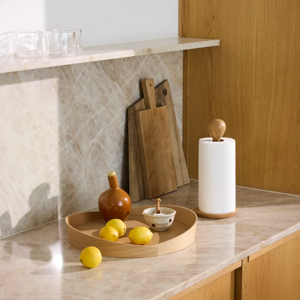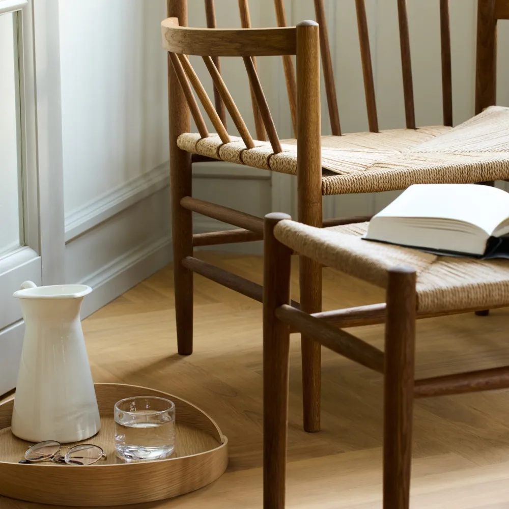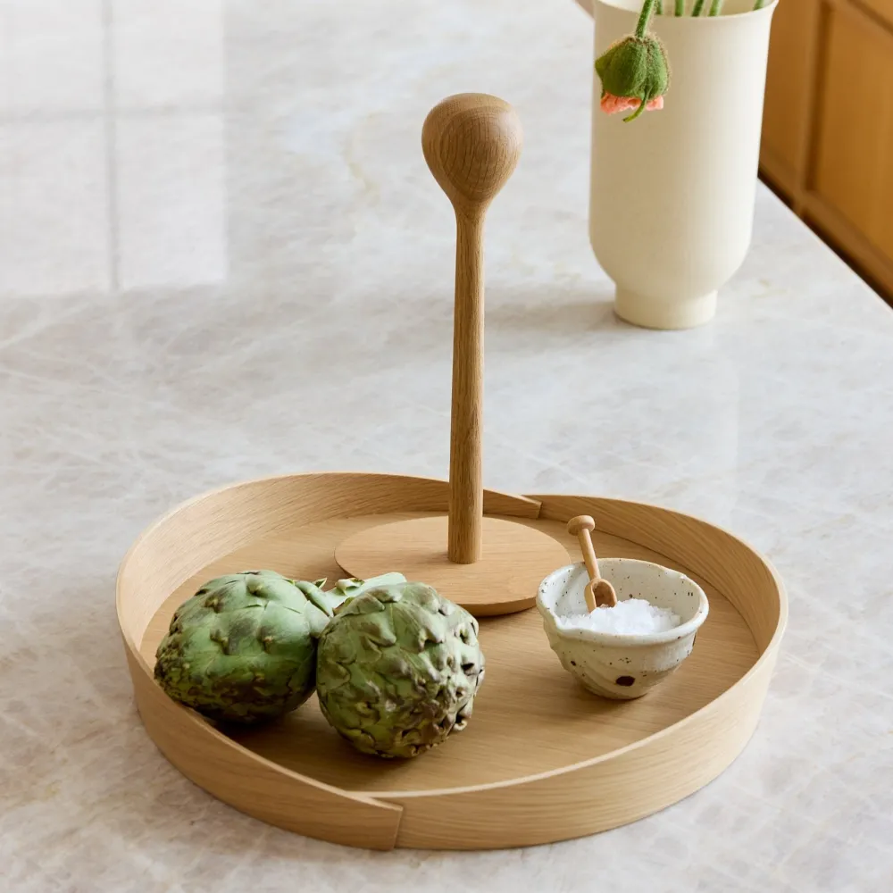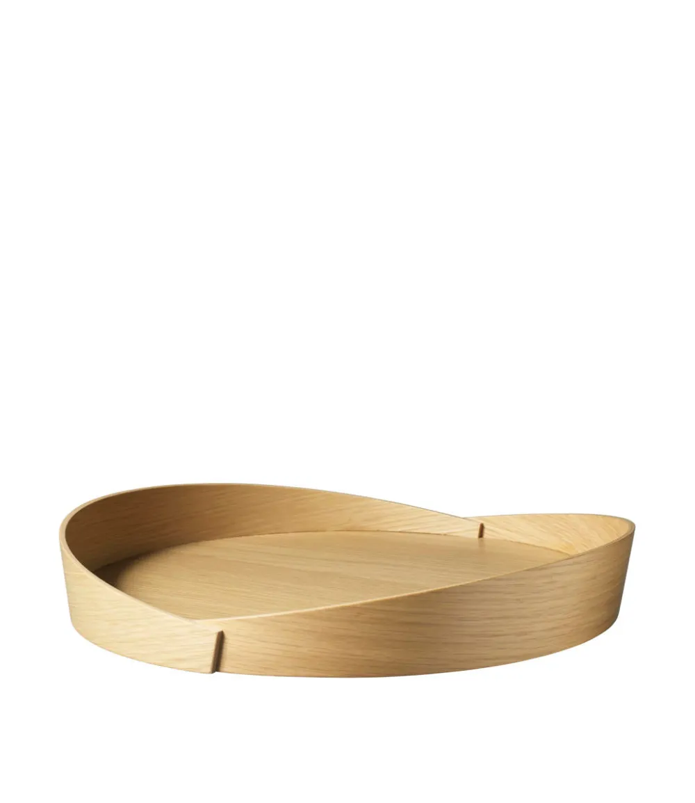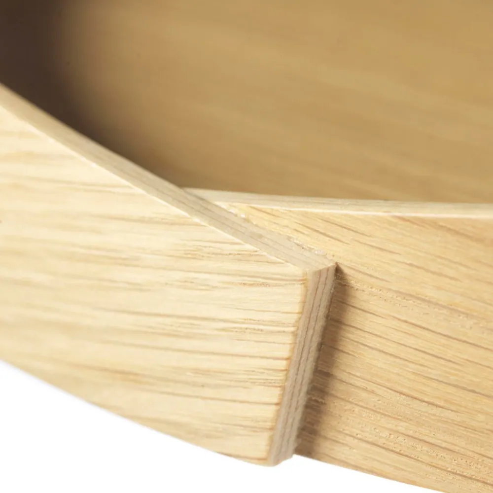 V43 Top er et smukt stykke snedkerhåndværk udført i FSC® -certificeret egetræ. Bakkens bløde kurver og flotte samlinger gør den til et iøjefaldende element, men designet er samtidig både organisk og roligt. Brug bakken til servering og opbevaring i køkkenet, til nipsting og blomster i stuen eller til morgenmad på sengen. Den flotte træbakke så første gang dagens lys som toppen af FDB Møblers Bakketop-bord, designet i samarbejde mellem designer Philip Bro og snedker Mathias Juul Overvad.