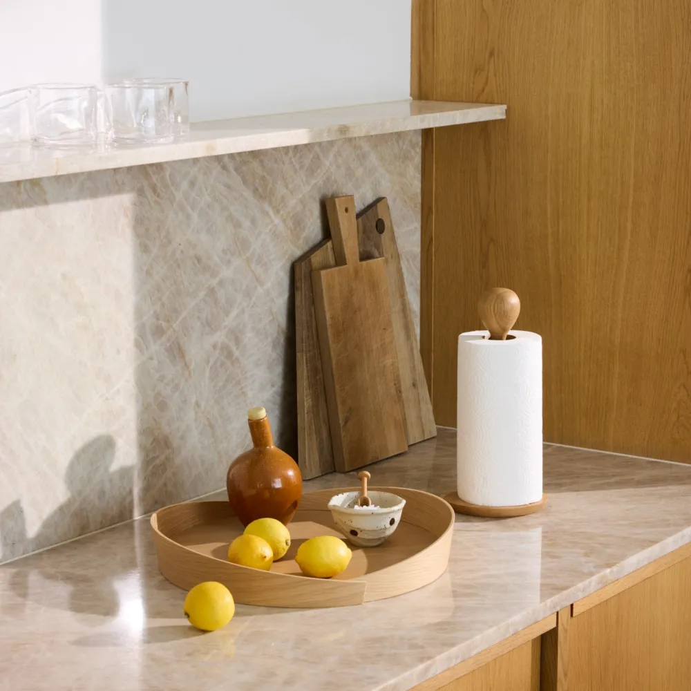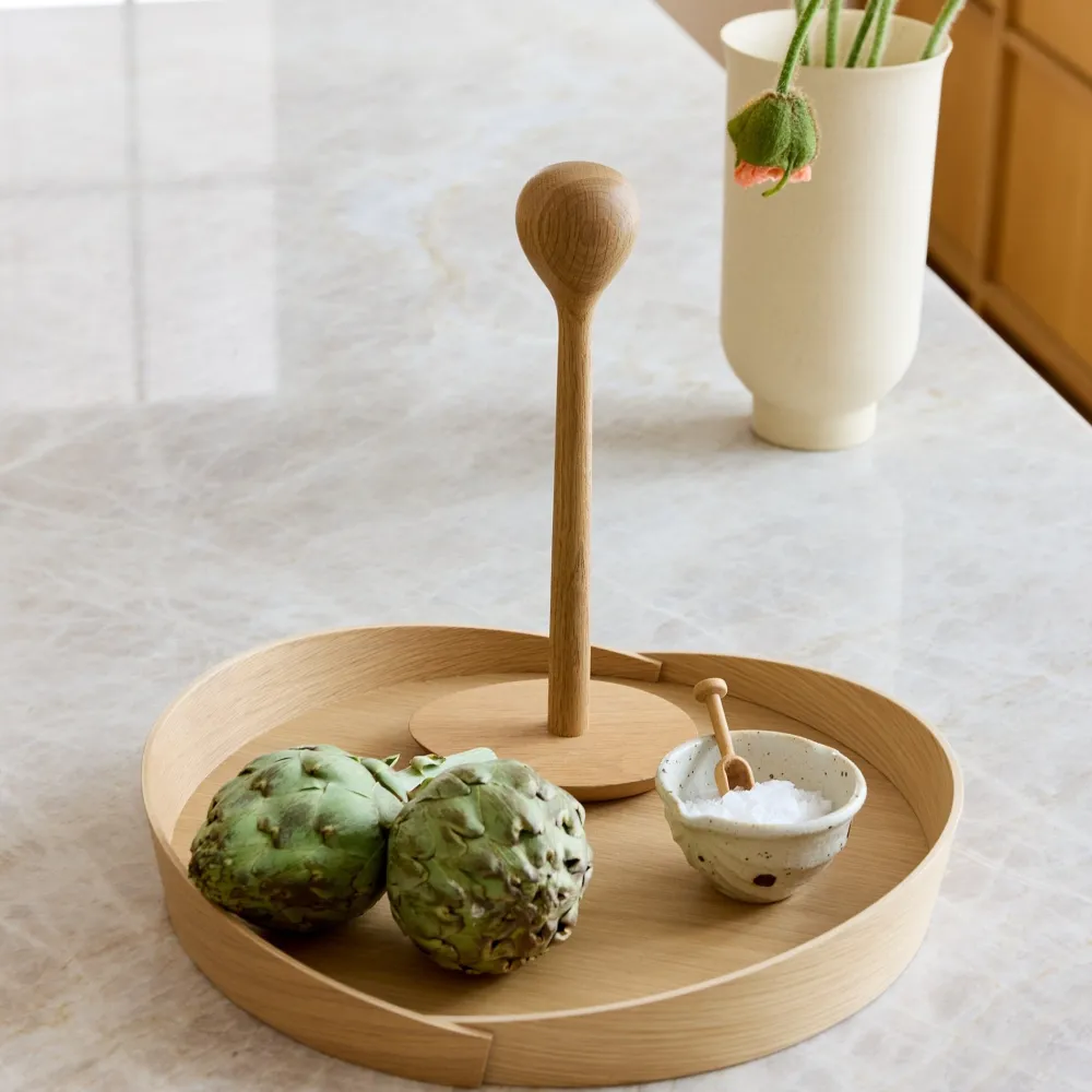 Kamma er skabt af designerduoen R7B Copenhagen. Køkkenrulleholderen har en fint afrundet top, der sikrer, at køkkenrullen holdes godt på plads, men samtidig er let at komme til i det daglige. Køkkenrulleholderen er en god ven i køkkenet, og den lever derfor fint op til sit navn, Kamma, som stammer fra det grønlandske ord for ven.