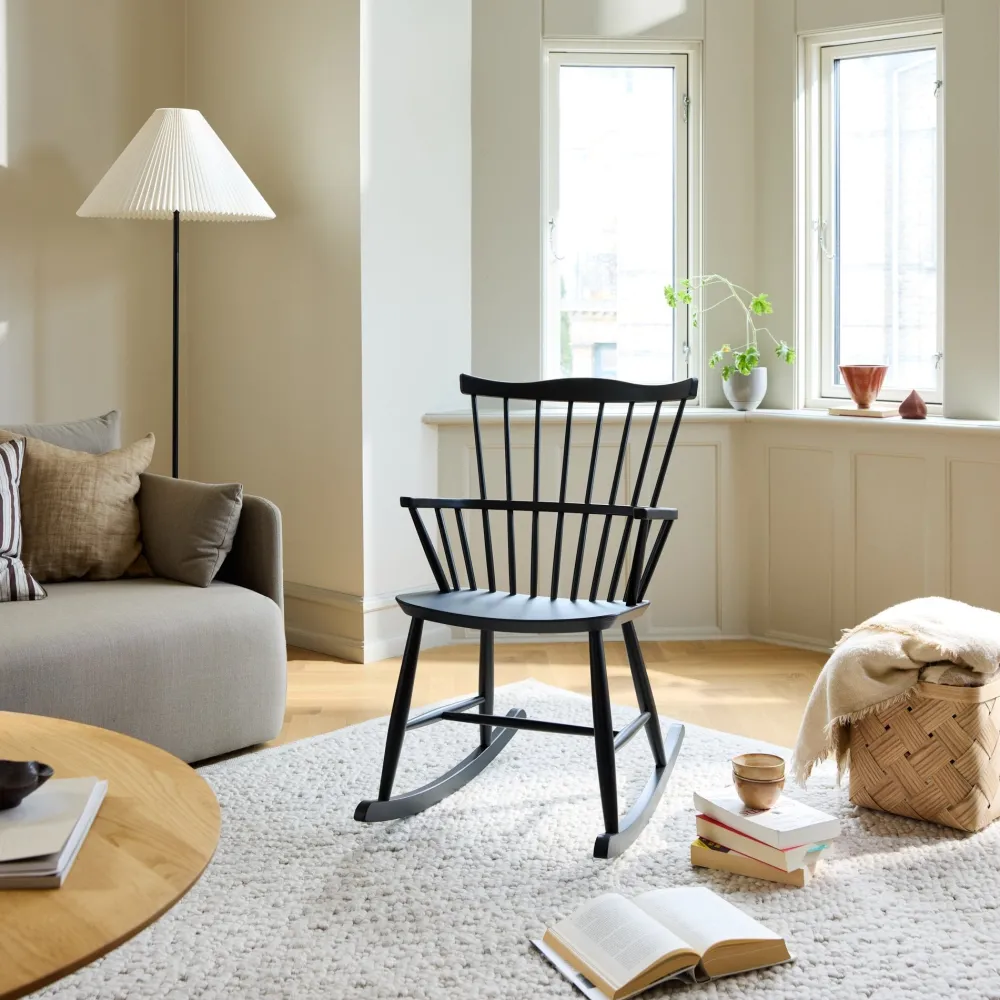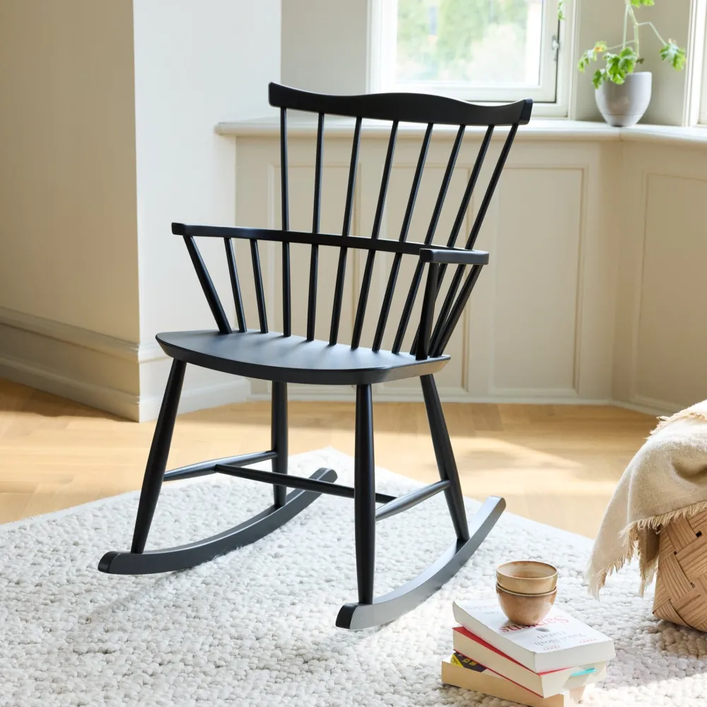 Både Børge Mogensen og Hans Wegner tegnede gyngestole til FDB Møbler. I 1950’erne kunne Børge Mogensen forbedre den i forvejen komfortable Windsorstol yderligere, da han tilføjede gyngemeder og skabte gyngestolen J52G. Stolen bærer Børge Mogensens elegante streg med rene linjer, og den fås i mange smukke farver. En stol til fordybelse, der både passer ind i dagligstuen og steder i hjemmet, hvor man vil have en plads til ro og fordybelse.