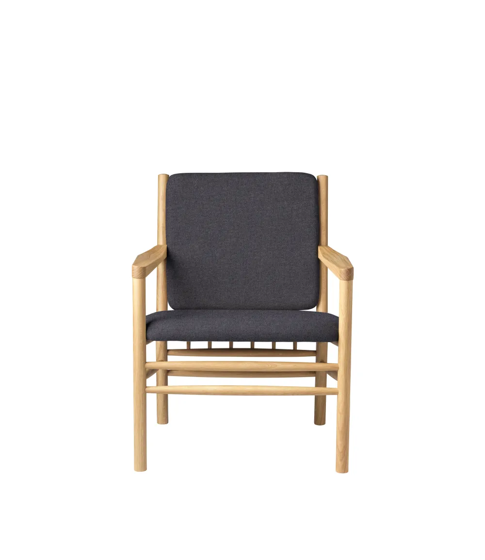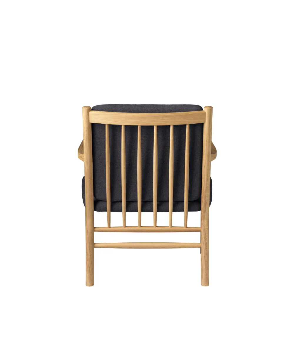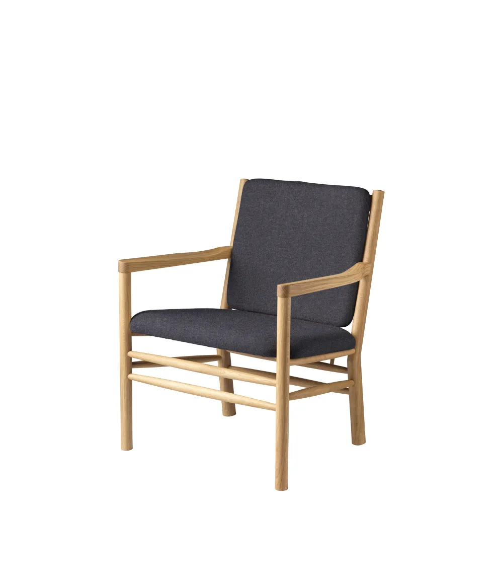 Loungestolen J147 er i familie med de andre møbler i Erik Ole Jørgensens berømte serie fra 1978, men har mere enkle armlæn uden tremmer. Det er en meget komfortabel lænestol, der indbyder til fordybelse, læsning og anden kvalitetstid. Den lægger sig i den fineste danske møbeltradition – uden at råbe op. Erik Ole Jørgensens serie af tremmemøbler er fra 1978 og har tydelige referencer til de andre store designere, der har skabt fundamentet hos FDB Møbler. Erik Ole Jørgensen havde baggrund som både møbelpolstrer og møbelarkitekt, og måske er det derfor, at samspillet mellem hynder og møbel er specielt vellykket her.