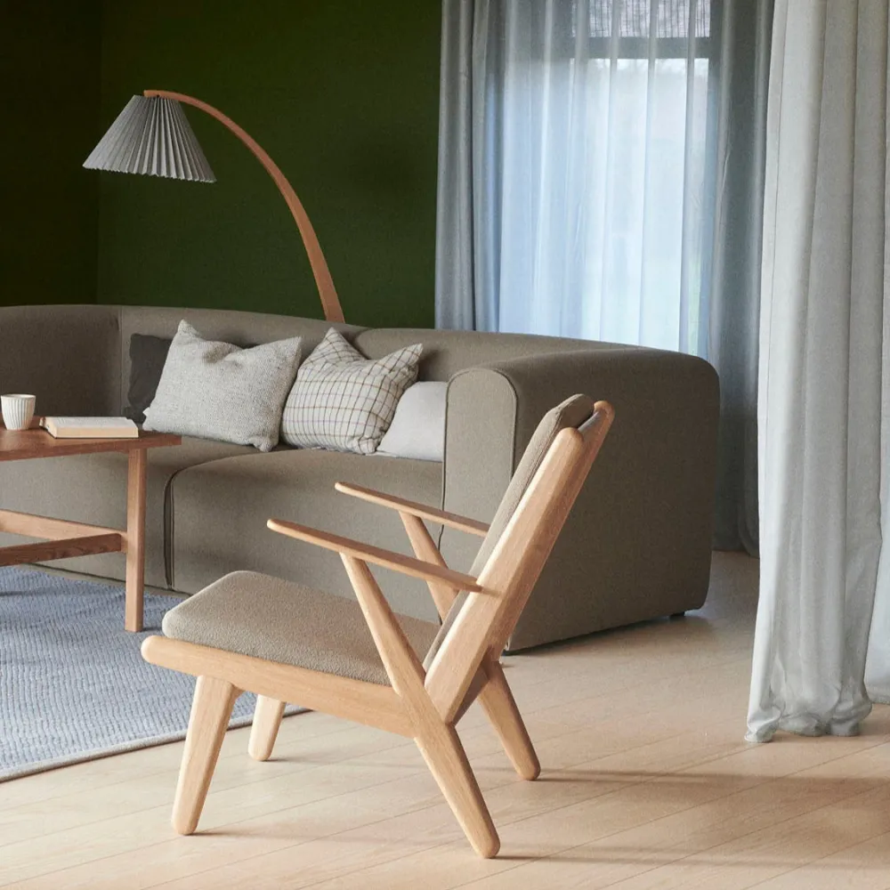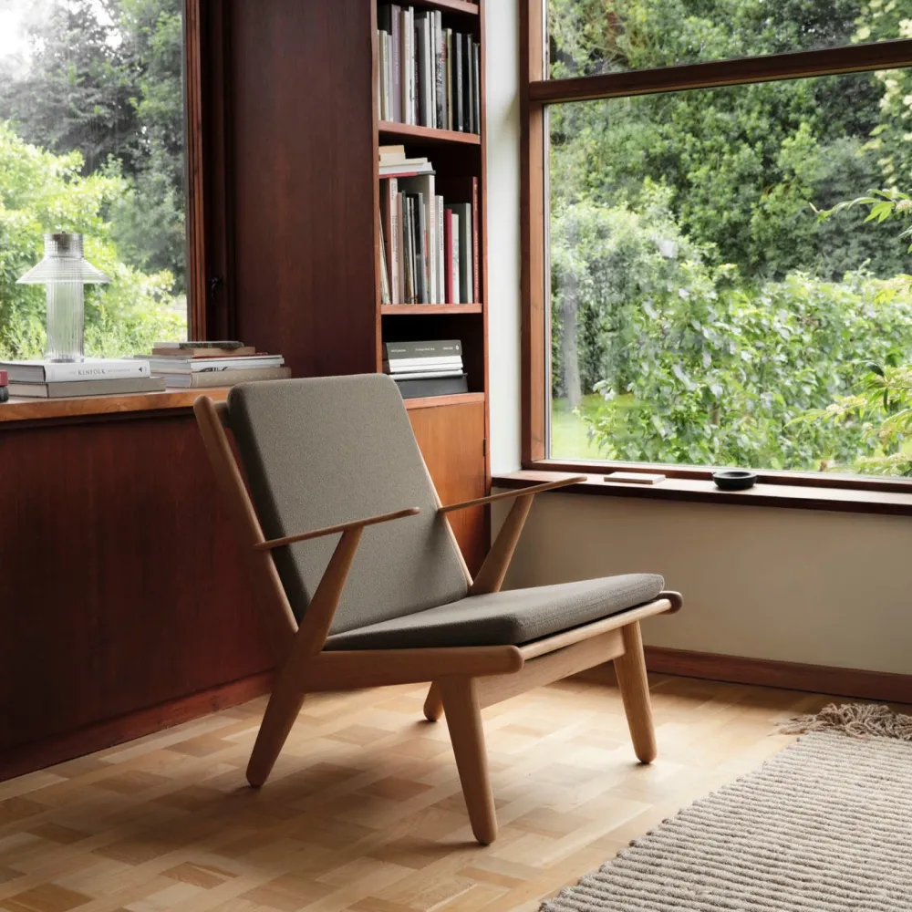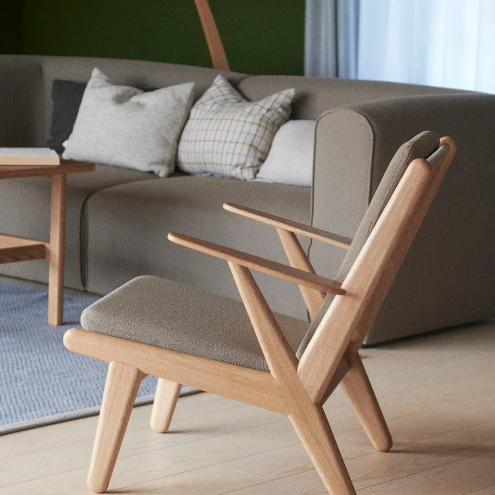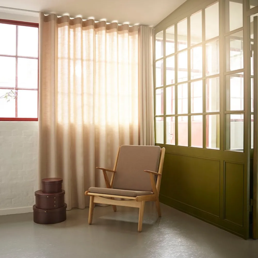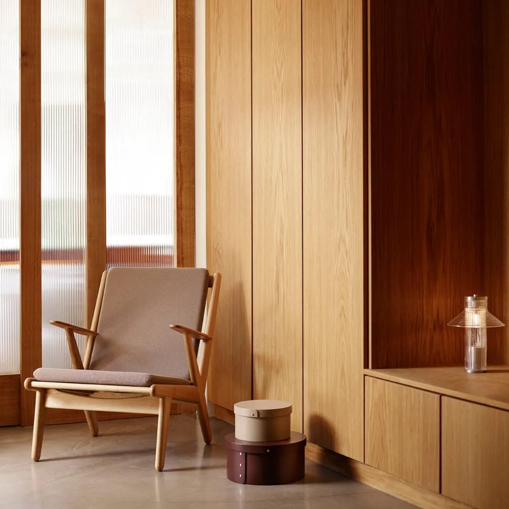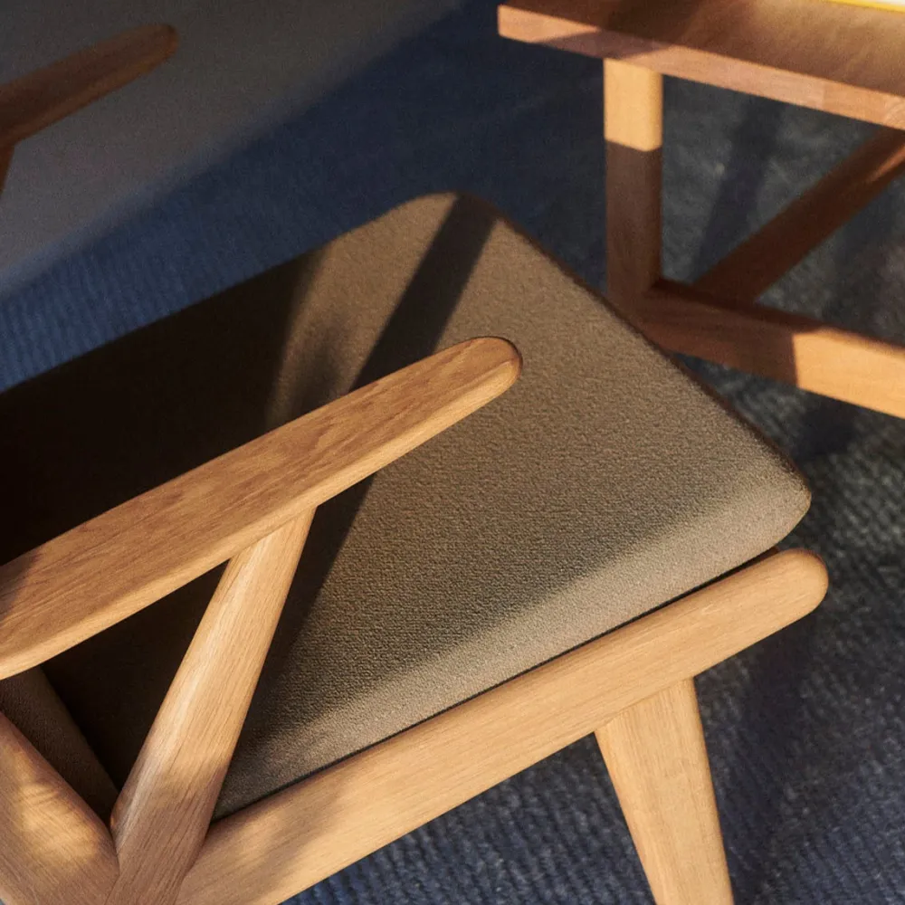 J53 er designet af møbelarkitekt Poul M. Volther i 1953. Designet blev oprindeligt lanceret som både lænestol og 2-personers sofa og er udtryk for et brud med den daværende designtradition, hvor de fuldpolstrede siddemøbler igennem årtier havde domineret stuerne. Nu var der plads til lettere og mere moderne møbler, og det passede perfekt til Volthers enkle og funktionalistiske formsprog. Da stolen blev lanceret i 1953, var Poul M. Volther tegnestueleder hos FDB Møbler, og i kølvandet på præsentationen lancerede flere af tidens store producenter lignende designs. J53 relanceres i 2024, da den er retrospektiv og relevant på samme tid, og er en af mange fantastiske stole fra Volthers hånd, der minder os om vores historie og arv.
