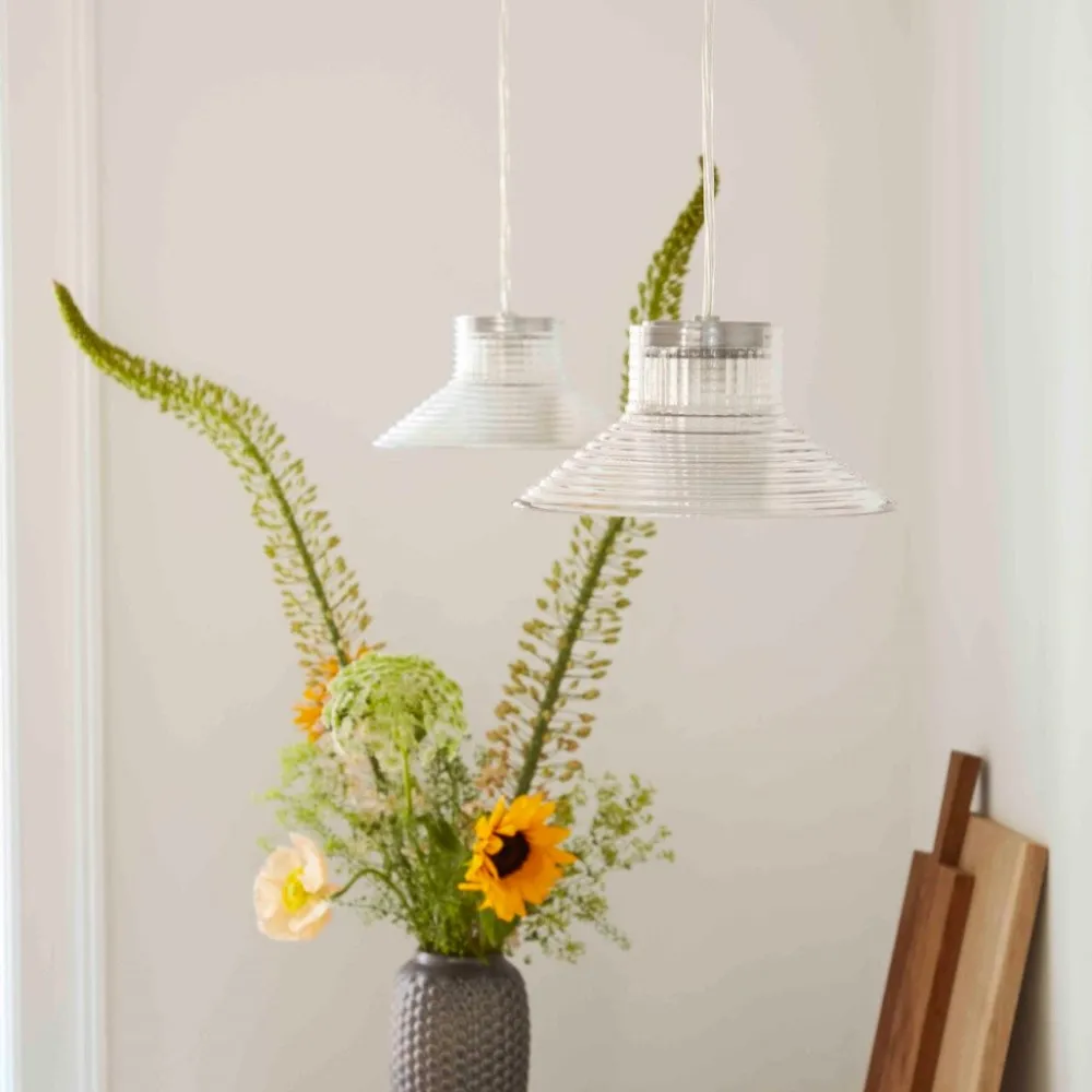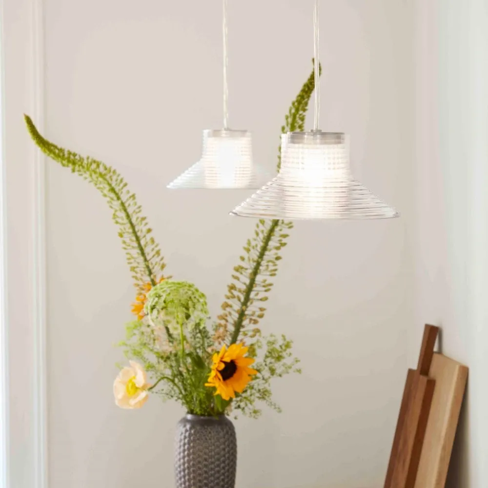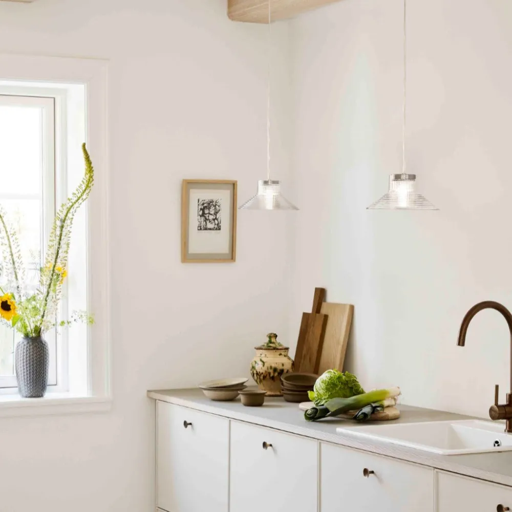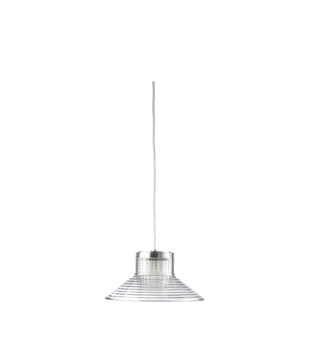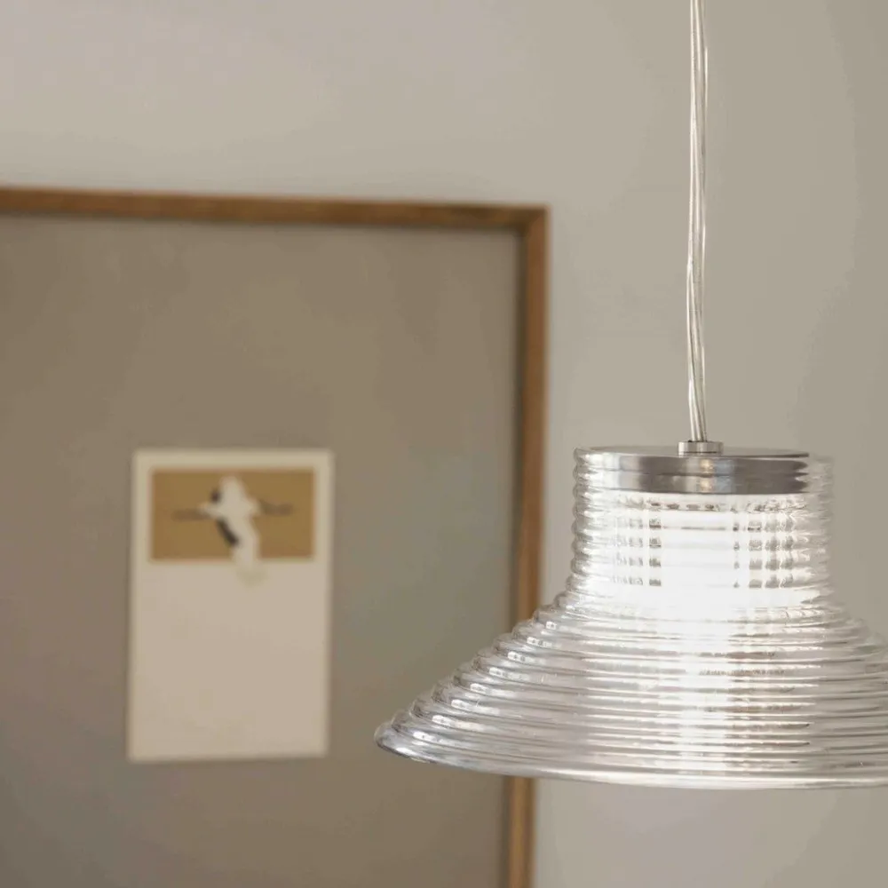 Sletterhage lampe-serie er opkaldt efter det ikoniske fyrtårn på Helgenæs. Sletterhage Fyr ligger midt i Danmark og har igennem årtier oplyst området og hjulpet både fiskere, lokale og turister med at navigere i det smukke område. Sletterhage-lamperne er udført i riflet glas i en transparent konstruktion, og inspirationen fra fyrtårnets mange industrielle elementer ses tydeligt i Laura Bildes design. Ved at bruge de samme glaskomponenter på forskellige måder har danske Laura Bilde skabt en tæt sammentømret lampefamilie, der elegant balancerer form og funktionalitet.