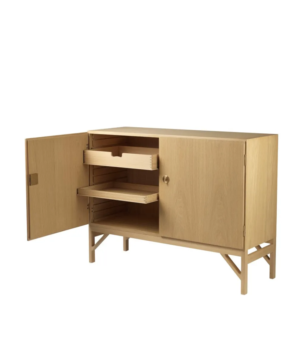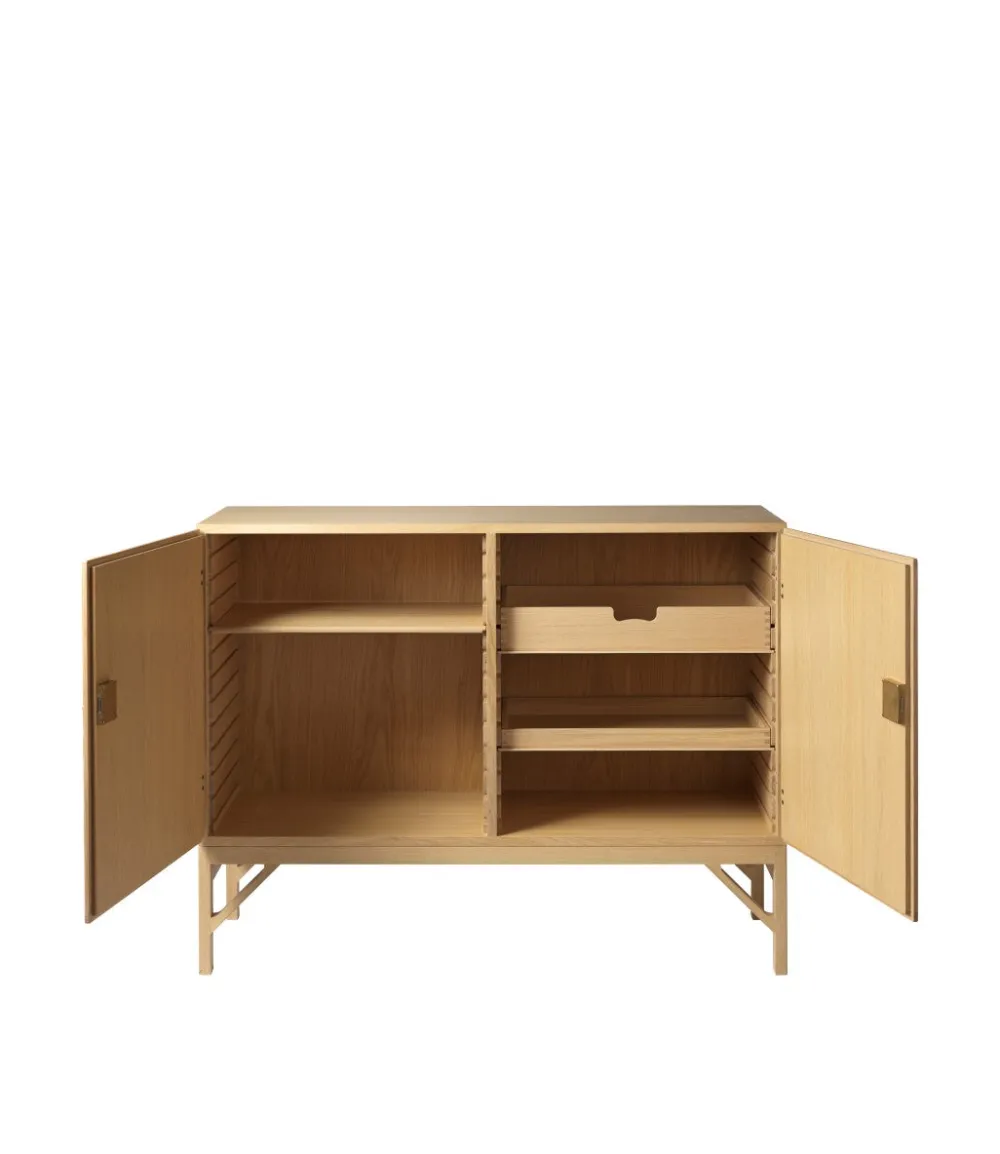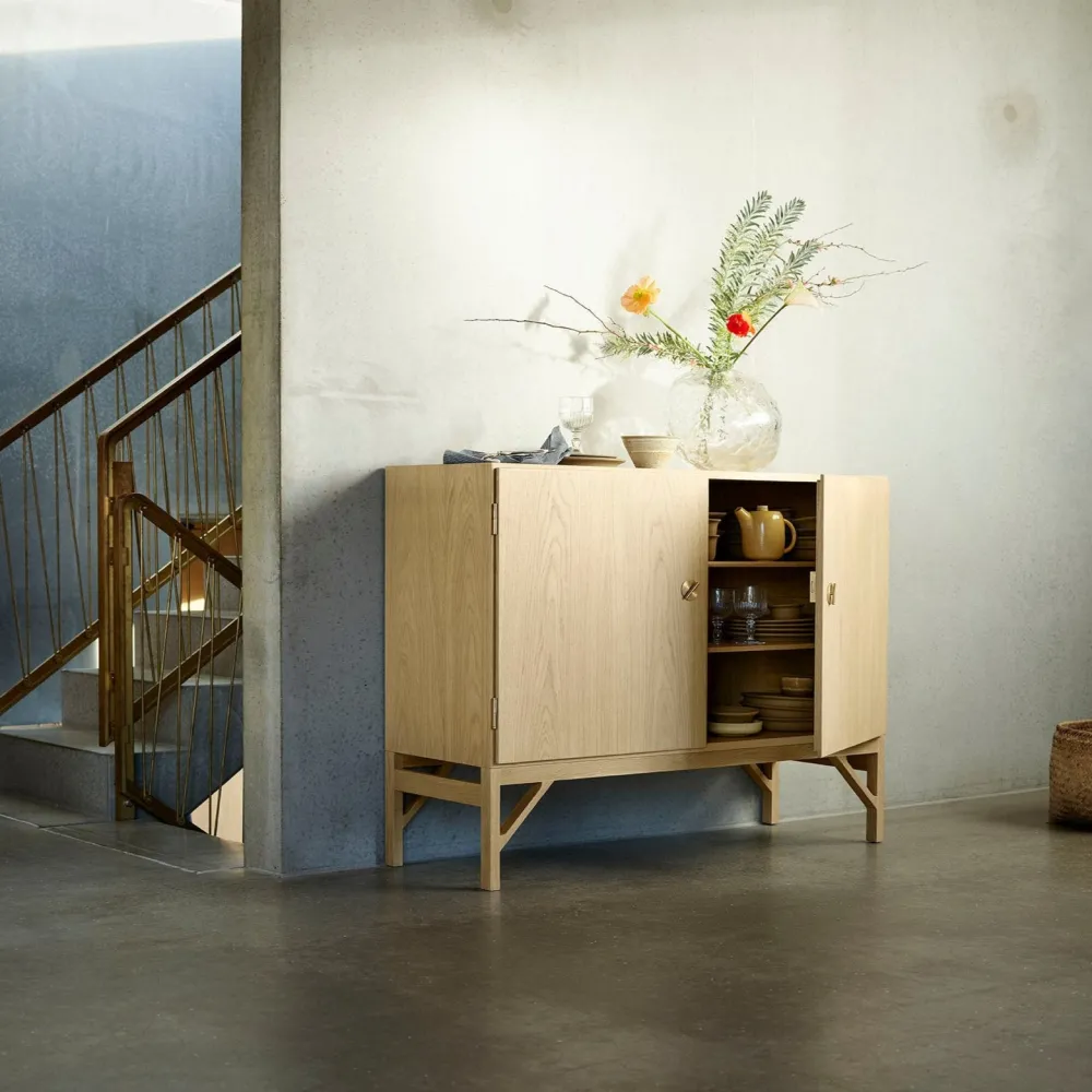 Børge Mogensens skænk, A232, optrådte første gang i FDB Møblers katalog tilbage i 1964. Siden har den været et eftertragtet vintagemøbel, og nu indgår den igen i FDB Møblers sortiment. Med sit funktionalistiske udtryk, er den en fornem repræsentant for et af dansk møbeldesigns største navne og et møbel, der både giver hjemmet et stilsikkert udtryk og en masse opbevaringsmuligheder. Den er produceret i FSC®-certificeret finér med specialfremstillede messingdele. Bakkerne kan tilkøbes i forskellige størrelser, så skænken kan indrettes til individuelle behov.