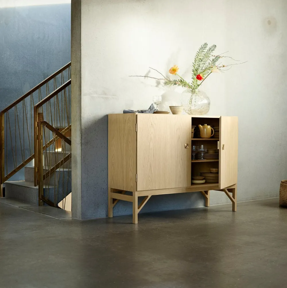 Børge Mogensens skænk, A232, optrådte første gang i FDB Møblers katalog tilbage i 1964. Siden har den været et eftertragtet vintagemøbel, og nu indgår den igen i FDB Møblers sortiment. Med sit funktionalistiske udtryk, er den en fornem repræsentant for et af dansk møbeldesigns største navne og et møbel, der både giver hjemmet et stilsikkert udtryk og en masse opbevaringsmuligheder. Den er produceret i FSC®-certificeret finér med specialfremstillede messingdele. Bakkerne kan tilkøbes i forskellige størrelser, så skænken kan indrettes til individuelle behov.