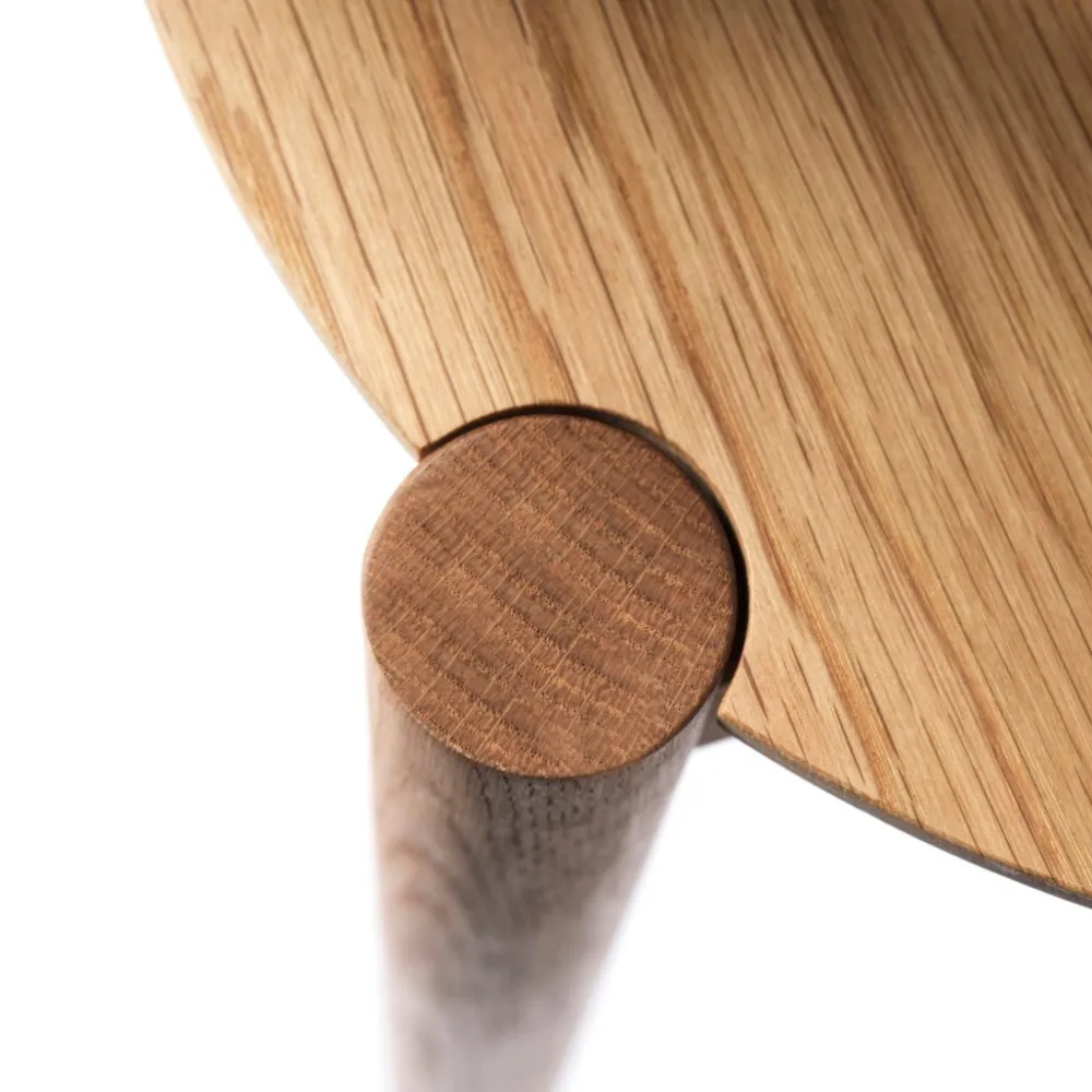 Stine Weigelt har tidligere skabt en pindestol til FDB Møbler. I forlængelse har hun skabt sofaborde og en skammel, der bærer den århusianske designers umiskendelige signatur. Lige som stolen har skamlen og sofabordet tre ben samt den fine lille detalje, hvor den øverste ende af benet møder bordkanten og danner en lille tangerende cirkel. Sofabordet findes i forskellige størrelser, og fungerer sammen som indskudsborde. Når man skal have lidt mere bordplads foran sofaen, kan et ekstra bord nemt findes frem. Bordet er designet til dagligt brug i hjemmet. Med den rette pleje kan dette bord holde mange år frem i tiden. Bordet er fremstillet i massivt egetræ. Egetræ er et naturmateriale, og der vil derfor være naturlige variationer i bordets overflade. Dette gør bordet unikt. Der vil aldrig være to borde som er helt ens.