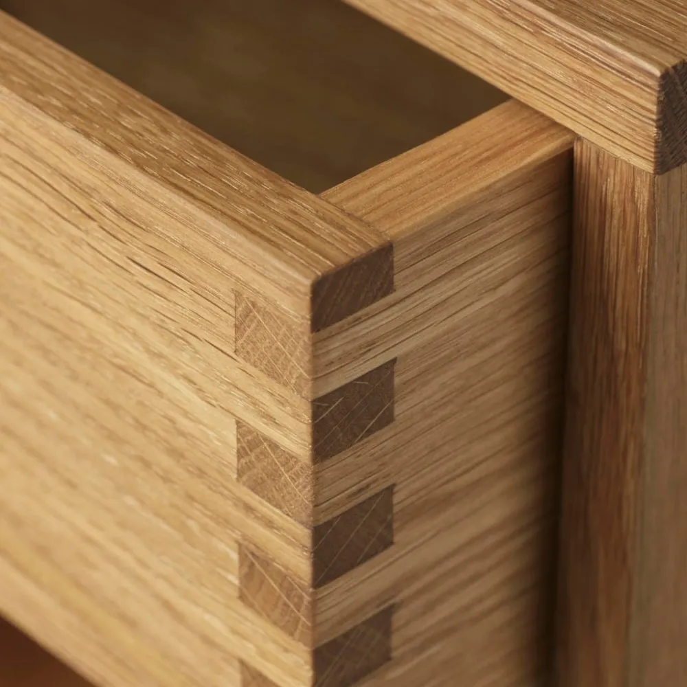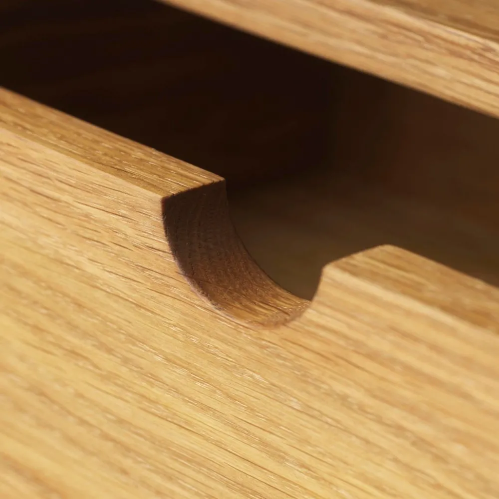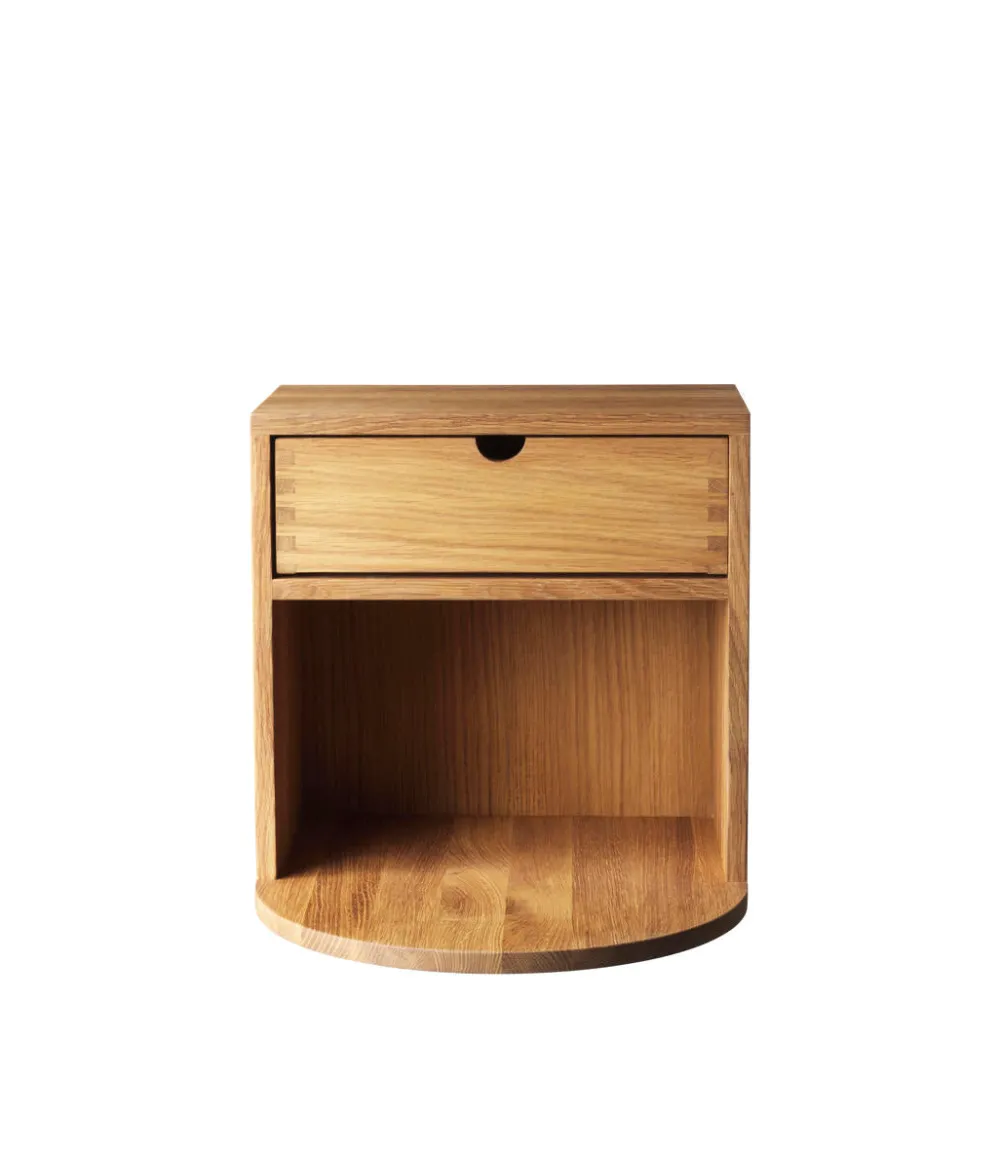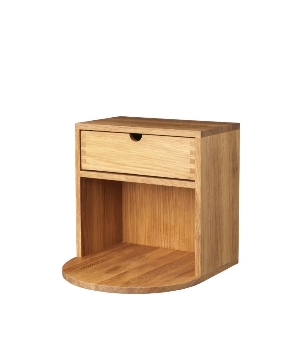 Vægskabet er designet til at hænge på væggen og har mange ligheder med den populære Bænk. Særligt kendetegnende er den halvrunde hylde og skuffen med tapsamlinger. Detaljerne understreger det gedigne håndværk og materialet, og egetræet tilfører et blødt og organisk look til designet. Vægskabet er et smukt møbel at vågne op til i soveværelset, og fordi det hænger på væggen, tilfører det samtidig et let og luftigt præg til rummet.
