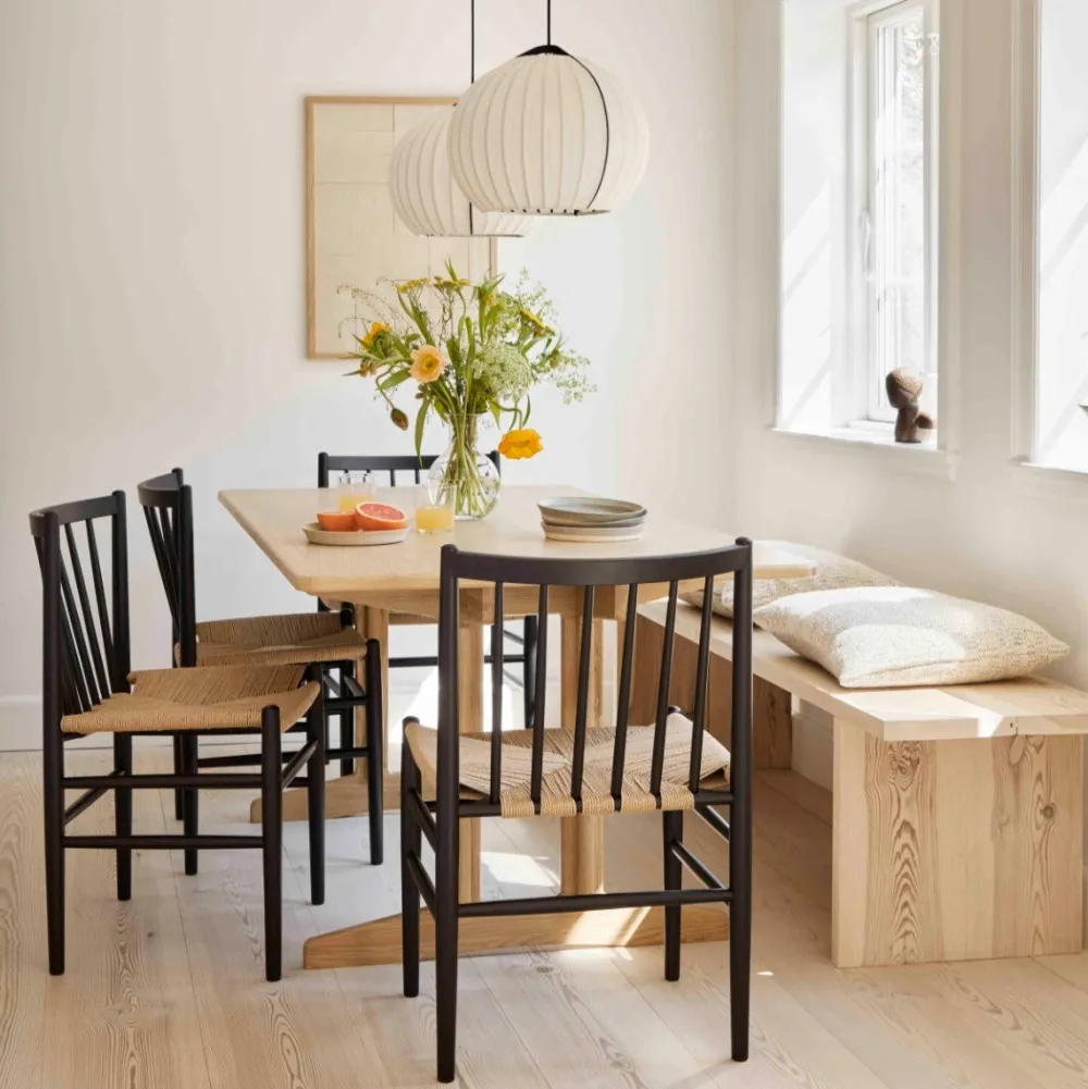 Denne fletserie af den kendte FDB-designer Jørgen Bækmark består af flere møbler, heriblandt den klassiske og ikoniske spisebordsstol J80. Stolen er fra FDB Møblers guldalder i 1950’erne, men har overlevet sin egen tid på grund af sit elegante og tidløse udtryk. J80, der også kan fås med armlæn og fungere som en fritstående stol, er behagelig at sidde i over længere tid, da den er fremstillet i kvalitetsmaterialer fra flet til det massive træ.