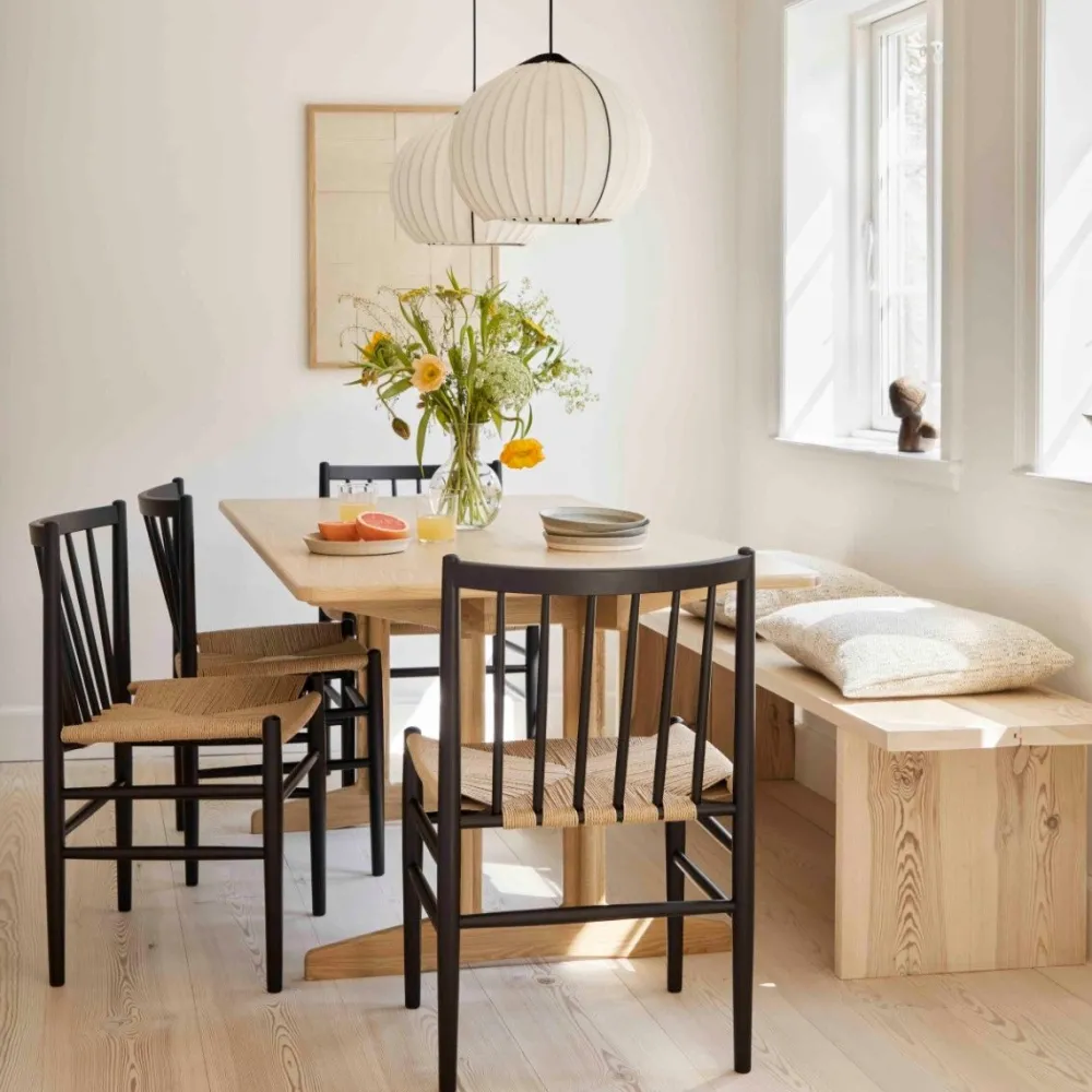 Denne fletserie af den kendte FDB-designer Jørgen Bækmark består af flere møbler, heriblandt den klassiske og ikoniske spisebordsstol J80. Stolen er fra FDB Møblers guldalder i 1950’erne, men har overlevet sin egen tid på grund af sit elegante og tidløse udtryk. J80, der også kan fås med armlæn og fungere som en fritstående stol, er behagelig at sidde i over længere tid, da den er fremstillet i kvalitetsmaterialer fra flet til det massive træ.