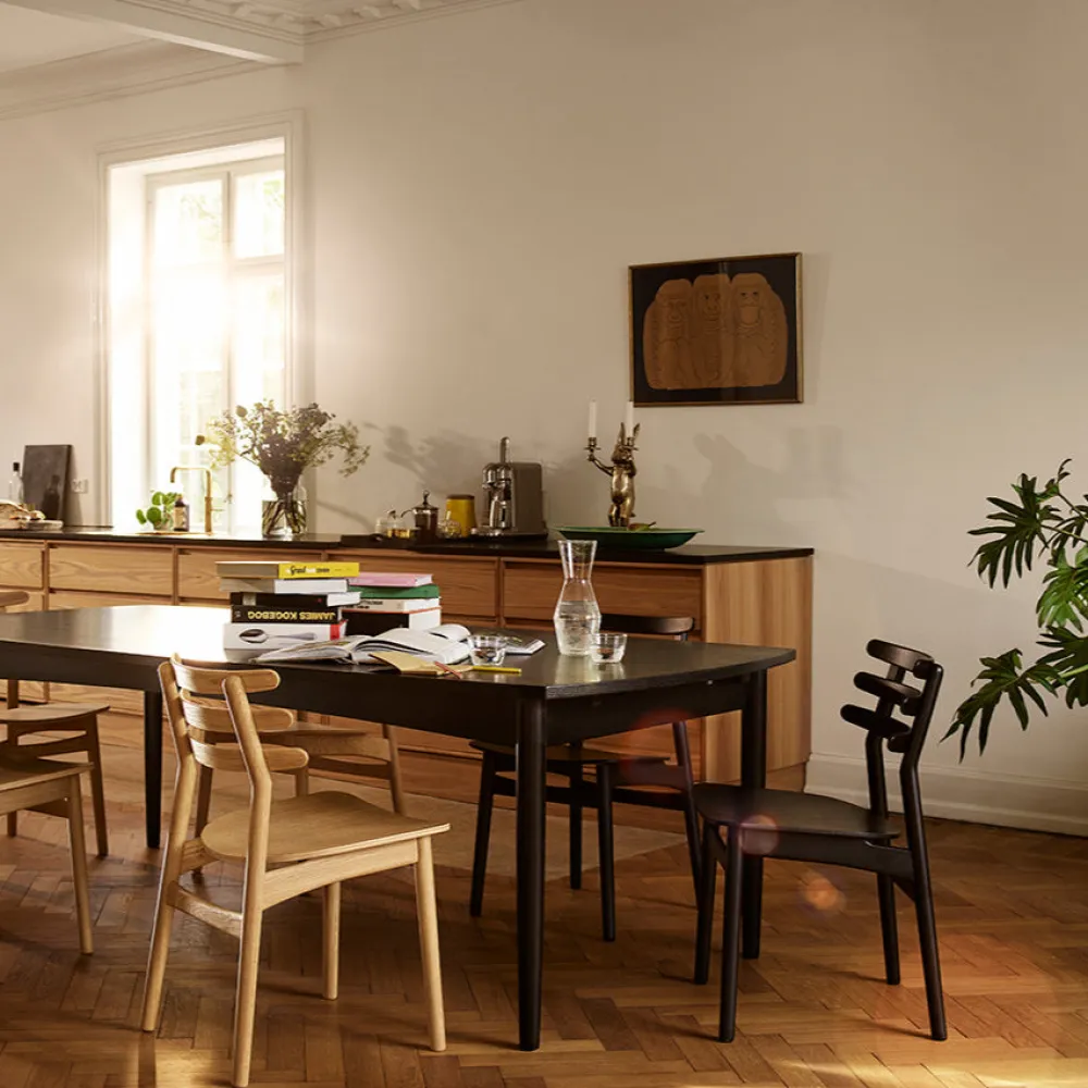 Stolen J48 er Poul Volthers klassiske spisebordsstol fra 1951 og er med årene blevet en af de mest populære stole i FDB Møbler’s sortiment. I J48 er der kredset for kvaliteten med den massive trækonstruktion i eg, og det polstrede sæde i enten skind eller tekstil. De afrundede og adskilte rygstøtter, der også er kendt fra Poul Volthers Corona stol, giver en behagelig siddekomfort og samtidig et æstetisk, unikt udtryk, der gør stolen til sin egen.